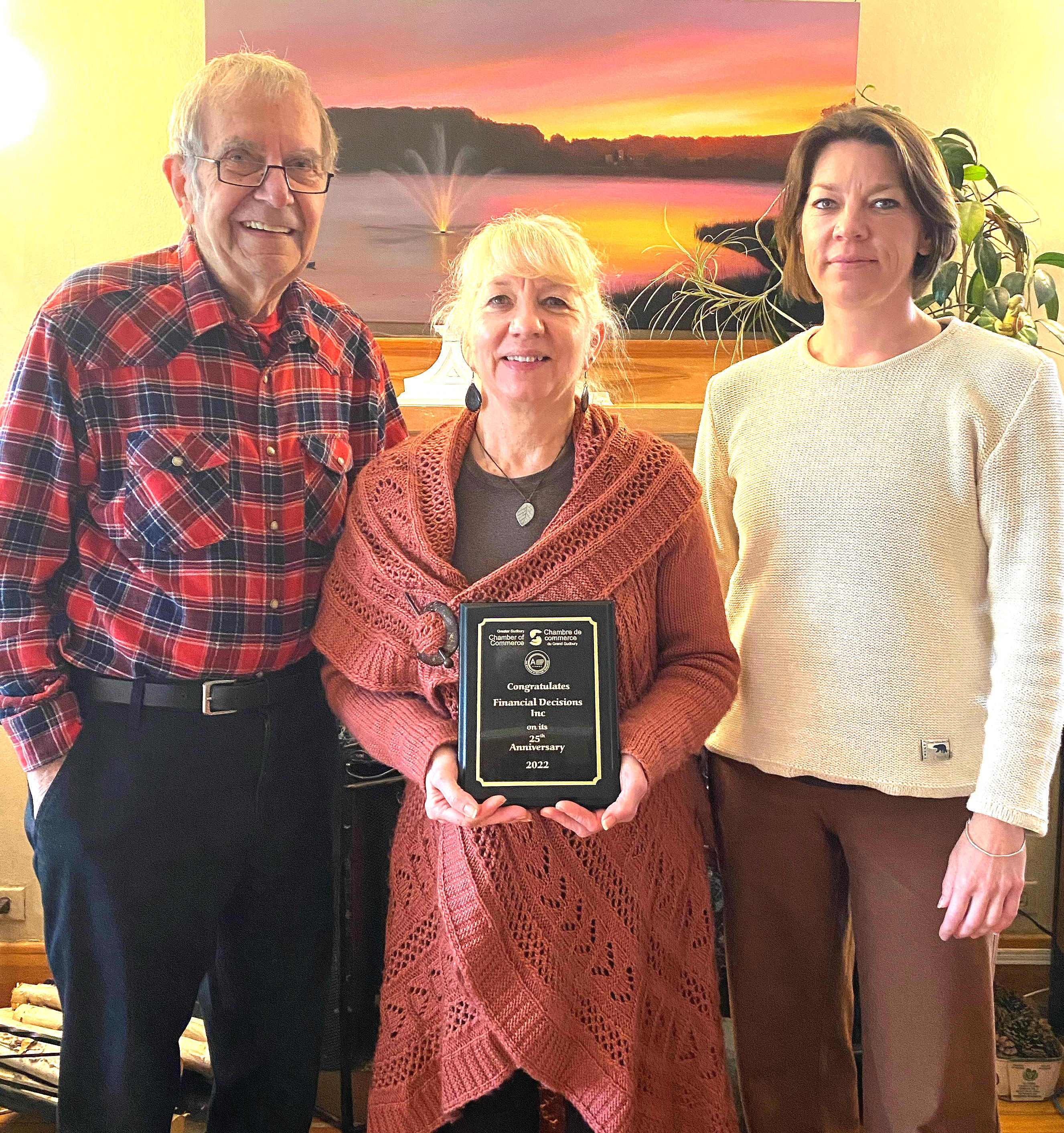 John, Linda and Mel with plaque celebrating 25 years membership in Chamber of Commerce. Both John and Linda have served on the board of the Chamber. |