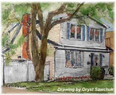 ![]() Tthe above painting by local artist Oryst Sawchuck, is on dispaly in the offie. The large tree is now gone, replaced by a flower garden.